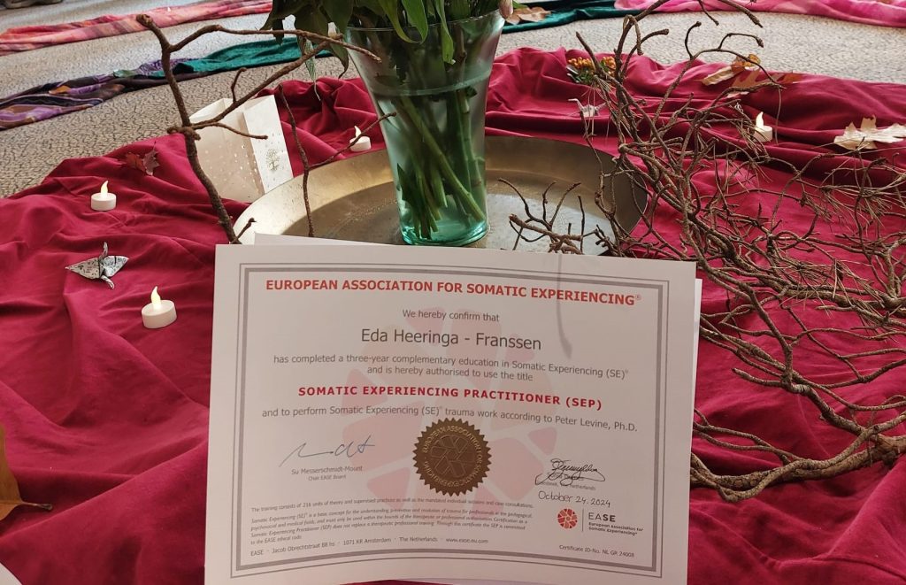 Door op een rustige en gedoseerde manier aandacht te geven aan deze lichamelijke signalen, geven we het zenuwstelsel de kans om de vastgehouden overlevingsenergie stap voor stap los te laten. Dit helpt het lichaam om zijn natuurlijke veerkracht te hervinden en terug te keren naar een staat van ontspanning en rust en draagkracht.